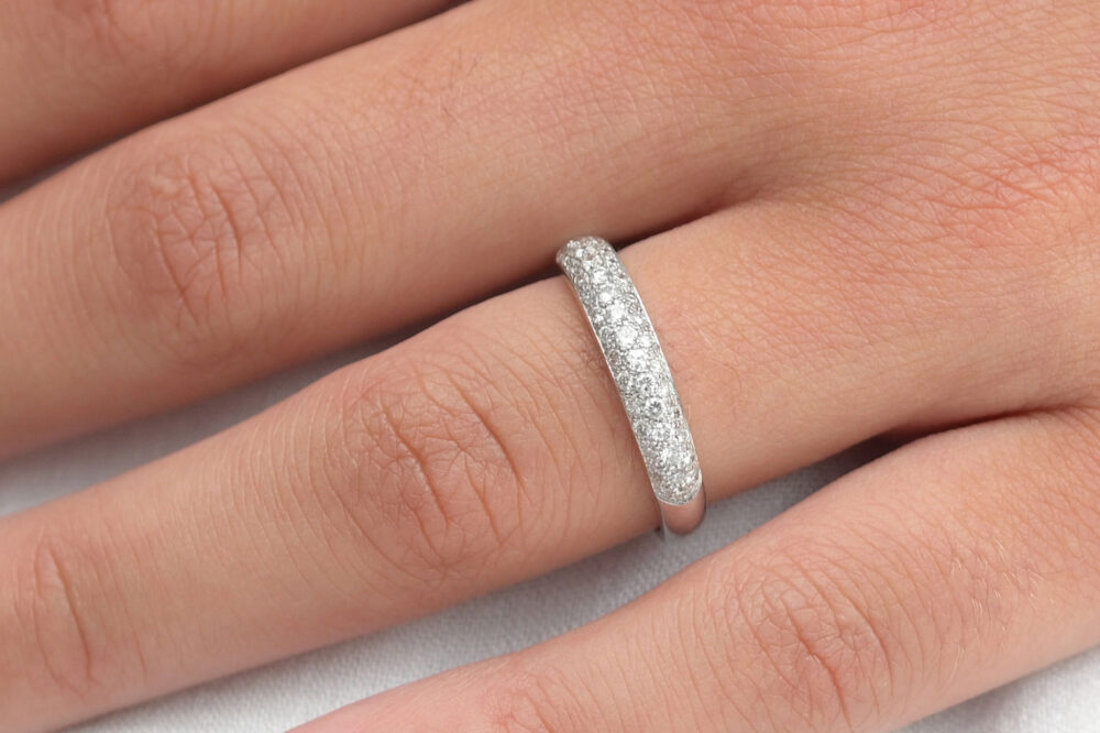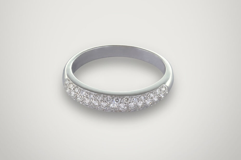 La bague Lina en or 18 carats est une alliance demi-jonc orné de 40 diamants ronds étincelants (0,52 ct). Son design royal diffuse des rayons de lumière éclatants, tandis que son anneau bombé et plat à l’intérieur assure un confort optimal.