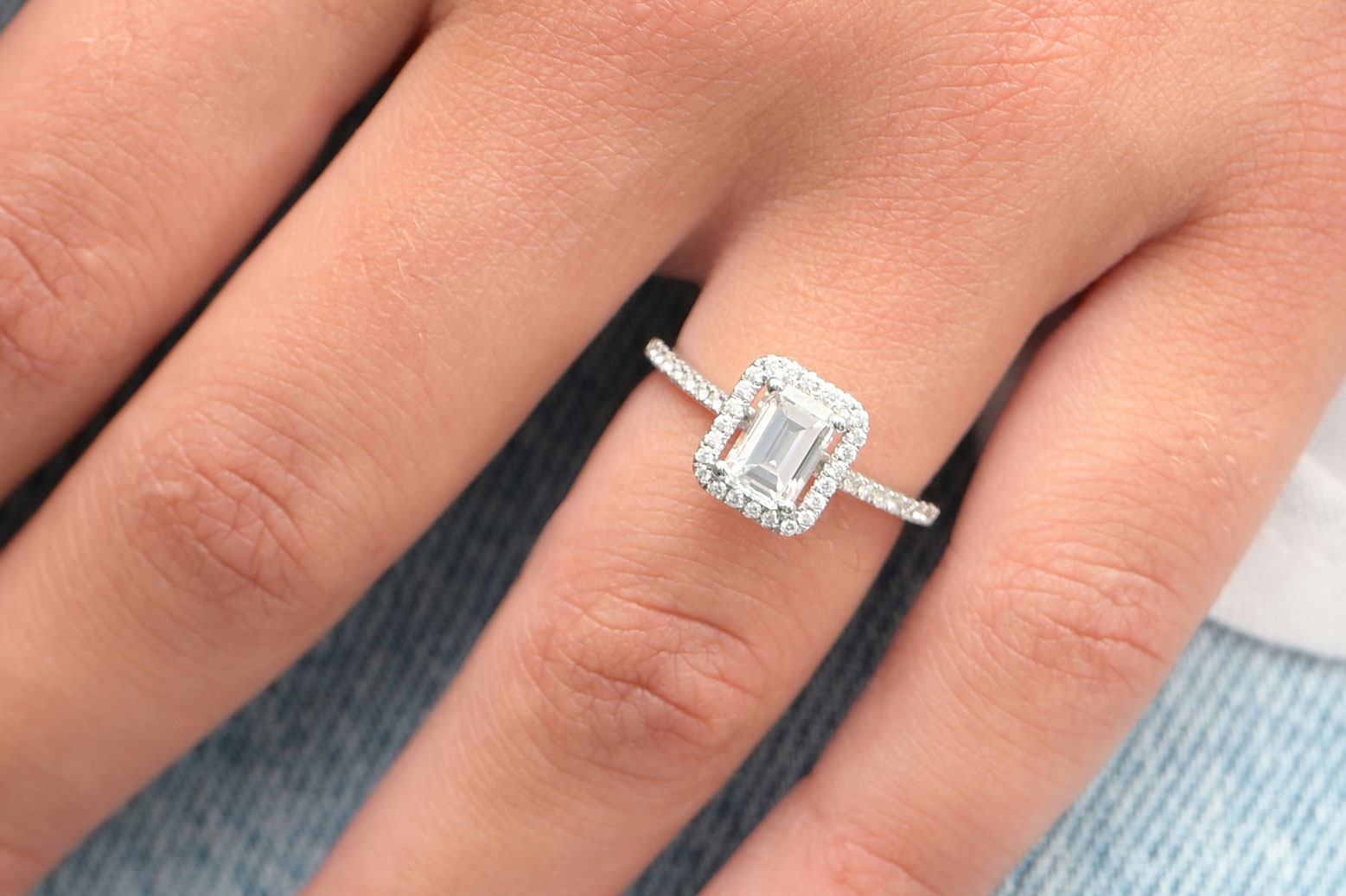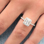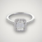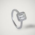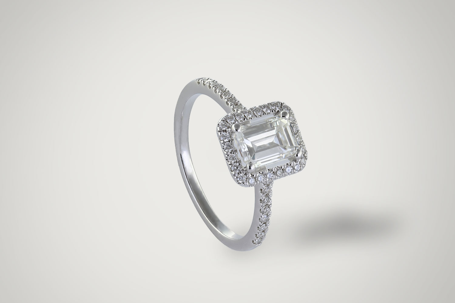 Tout comme les sentiments de bonheur ressentis lors des vos fiançailles, la bague de fiançailles Lucie de Somonian serait un match parfait avec vos sentiments, puisqu’elle projette de la lumière et des étincelles à tout-va. Cette bague en or blanc 18 carats est ornée, au centre, d’un élégant diamant taille émeraude (0,95 ct) qui est, quant à lui, entouré de diamants brillants sertis de perles et d’un magnifique anneau de diamants, ce qui fait au total 40 diamants (0,30 ct). Découvrez aussi notre bague Boule, un autre chef-d’œuvre exquis.