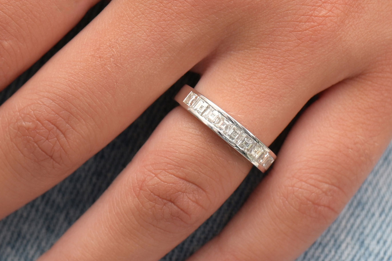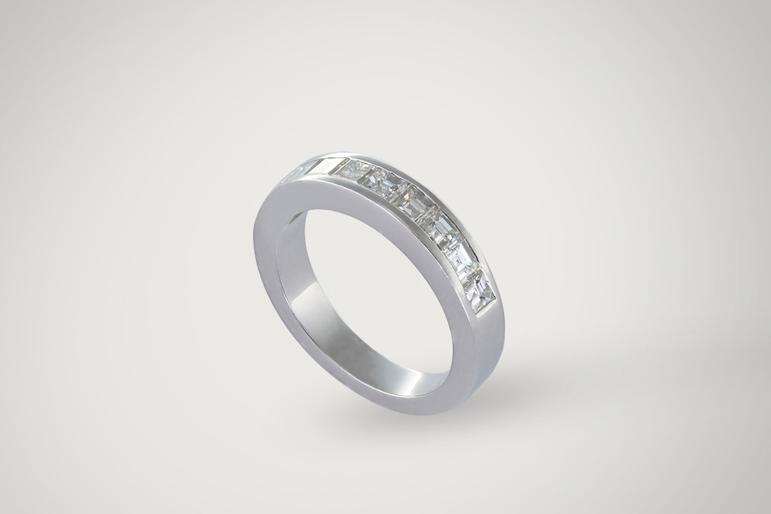 Lya est une alliance demi-cercle en or blanc 18 carats, ornée de 10 diamants baguette 0,80 ct). Le pavé de diamants brillants rayonne, mettant en valeur le doigt avec une clarté exceptionnelle, parfaite pour symboliser une promesse éternelle d’amour.