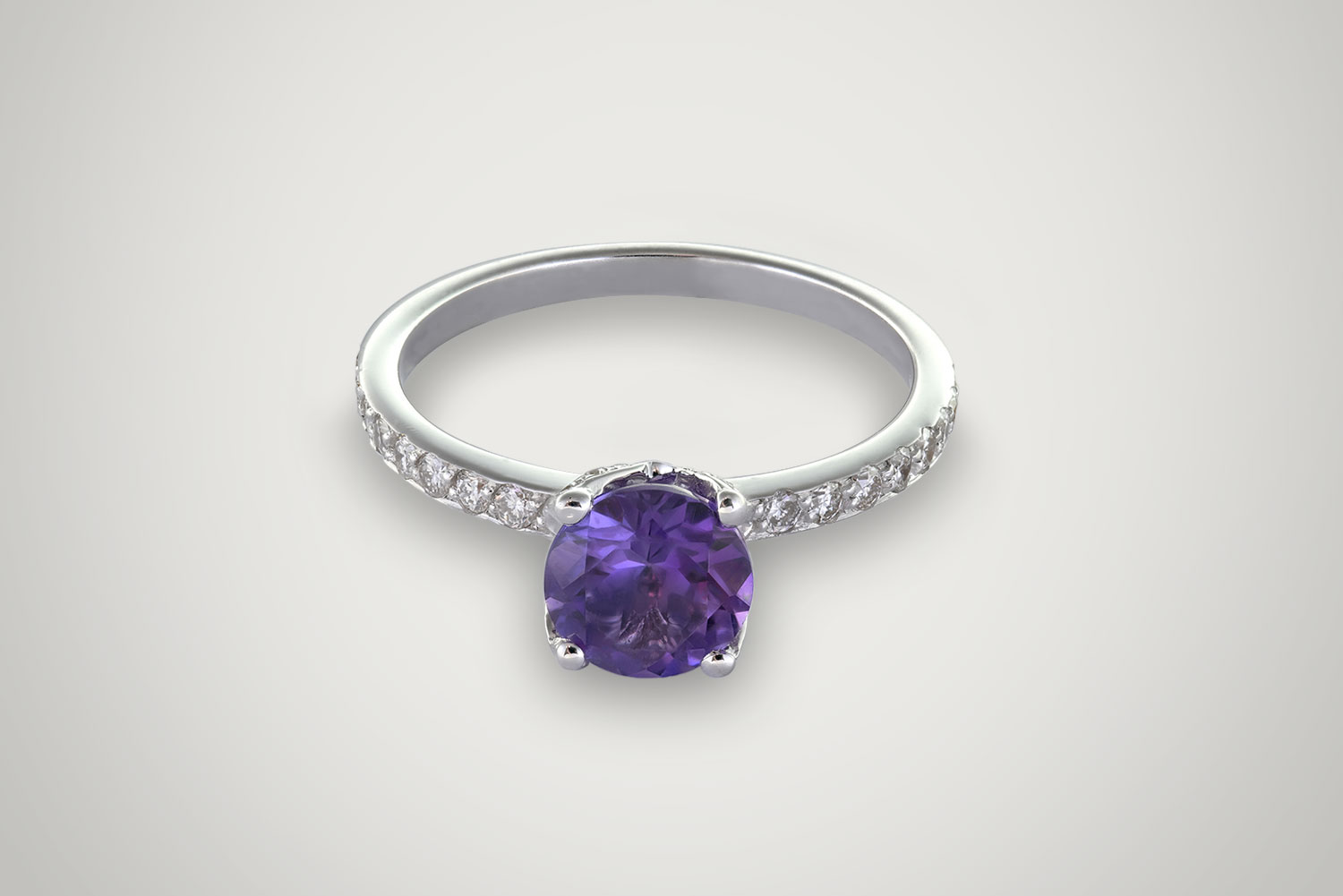 Inspirée par la couleur violette, la bague solitaire Violette met en valeur une améthyste ronde étincelante (0,80 ct) en son centre. Ce somptueux bijou en or blanc 18 carats, sublimé par un pavage de 18 diamants ronds brillants (0,28 ct), incarne une beauté divine et une séduction intemporelle.