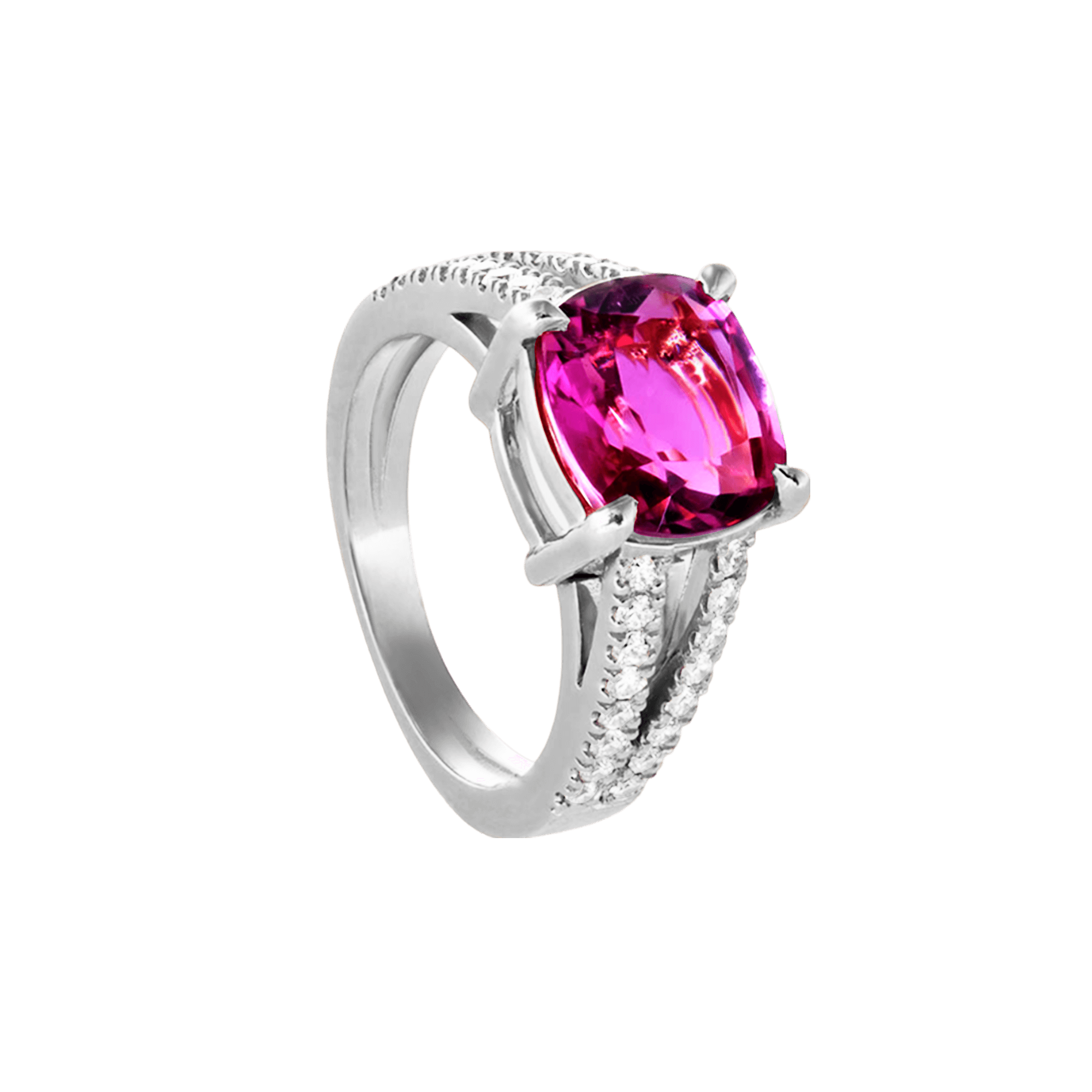 Découvrez la bague Manon, une création d’exception qui célèbre la rareté et la beauté exquise d’une tourmaline rose fuchsia.