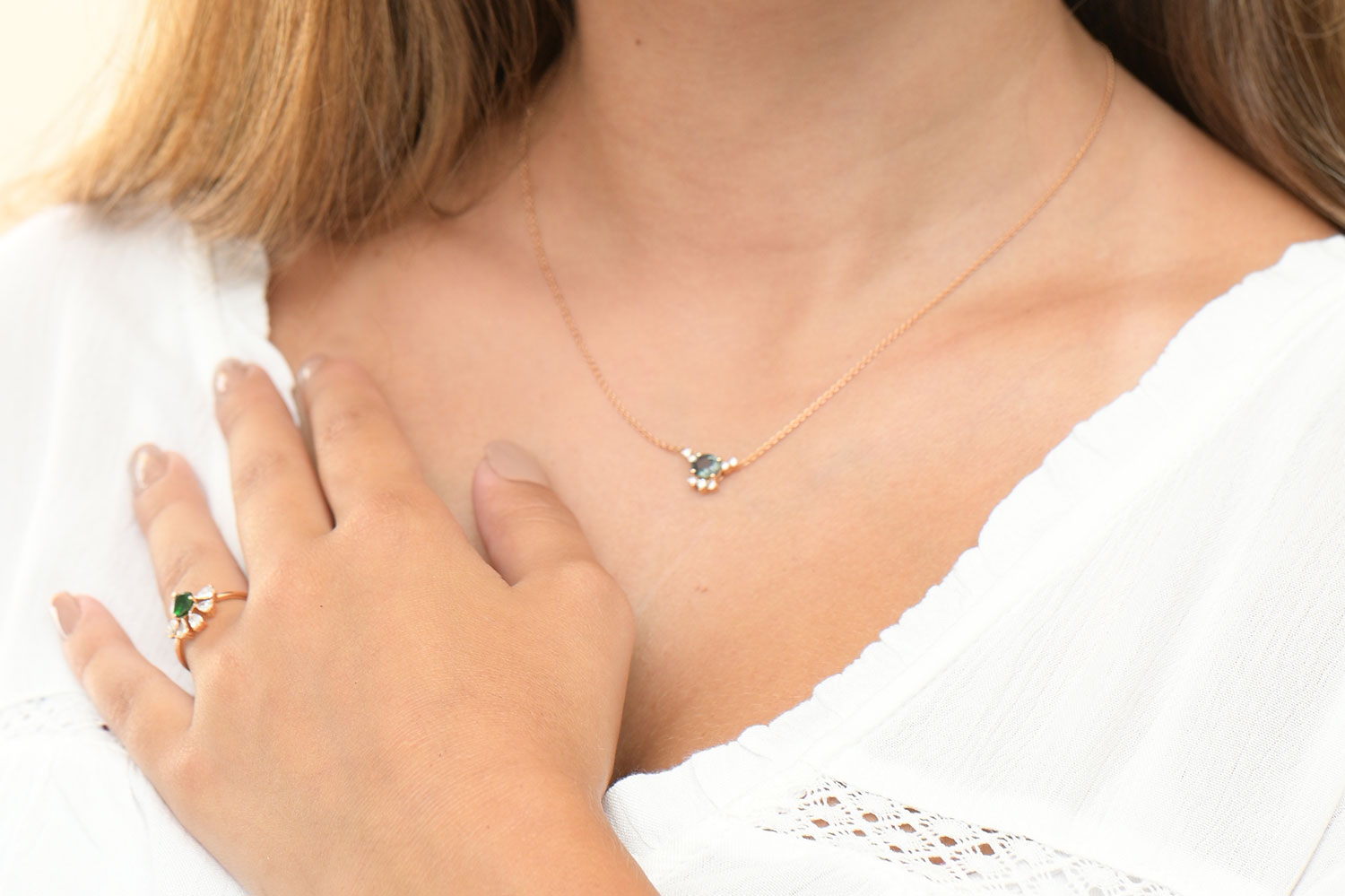 Iris fait partie de nos collections de bijoux au charme intemporel. Ce superbe pendentif contenant une pierre précieuse ovale de saphir (1,03 ct) ajoute un certain style à vos looks. Ce qui le rend plus éblouissant encore, ce sont les 7 diamants précieux (0,11 ct) qui entourent la pierre de saphir. Ce collier fait main en or jaune 18 carats sera alors en parfait accord avec notre bague Fleur. Vous cherchez une autre pièce magique que vous pourriez porter avec une tenue décontractée voire élégante ? Alors n’hésitez pas à checker notre bague Olivia.