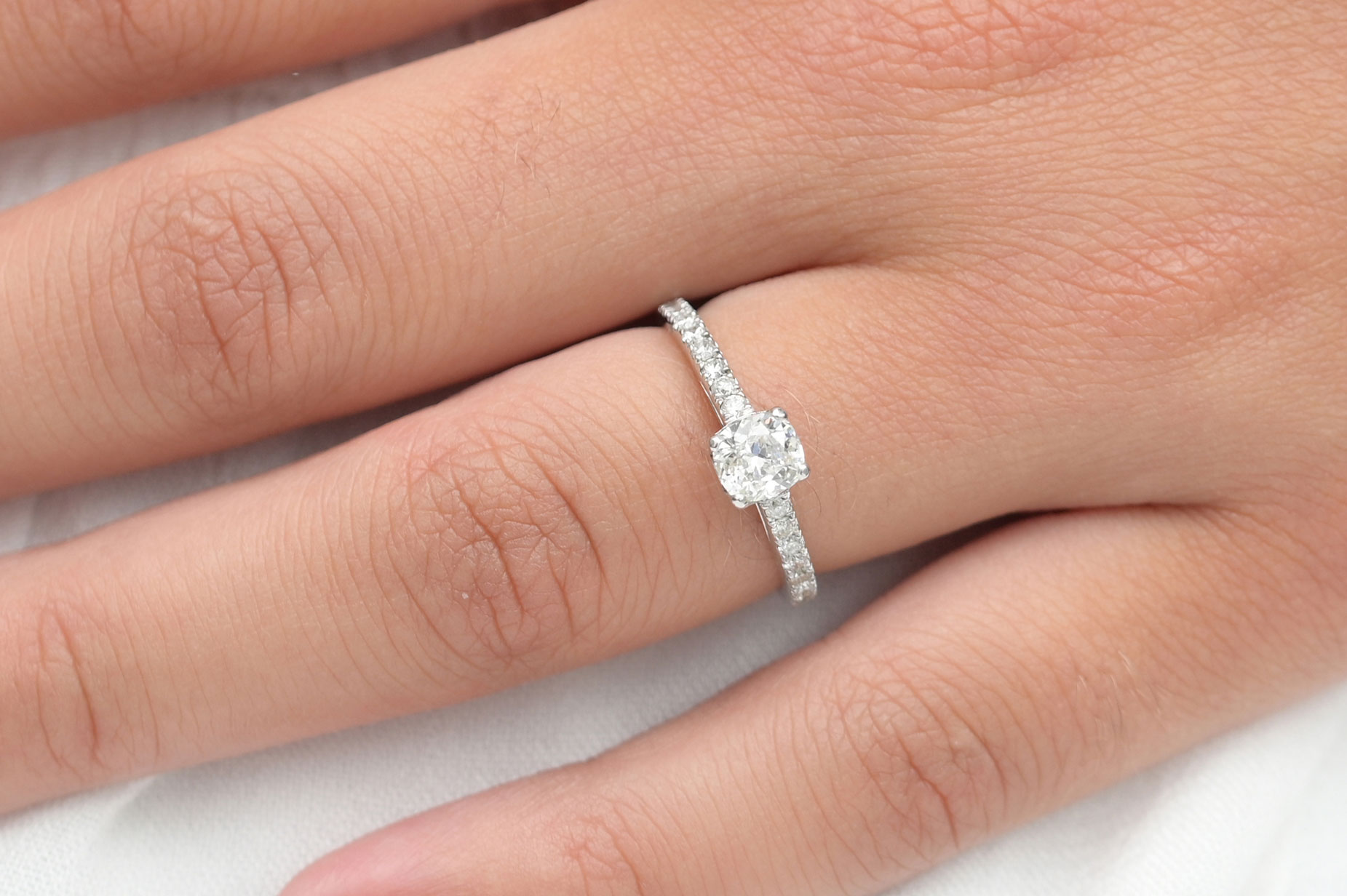Tout comme les sentiments de bonheur ressentis lors de vos fiançailles, la bague solitaire Jacqueline Coussin de Somonian symbolise la lumière et la pureté des émotions. Cette somptueuse création en or blanc 18 carats est sublimée par un diamant central brillant taillé en coussin (0,50 ct), entouré d’un semi-pavé de 18 diamants latéraux (0,22 ct). Cette combinaison harmonieuse de pierres précieuses confère à cette bague un éclat extraordinaire, parfait pour célébrer les moments les plus mémorables de votre vie.