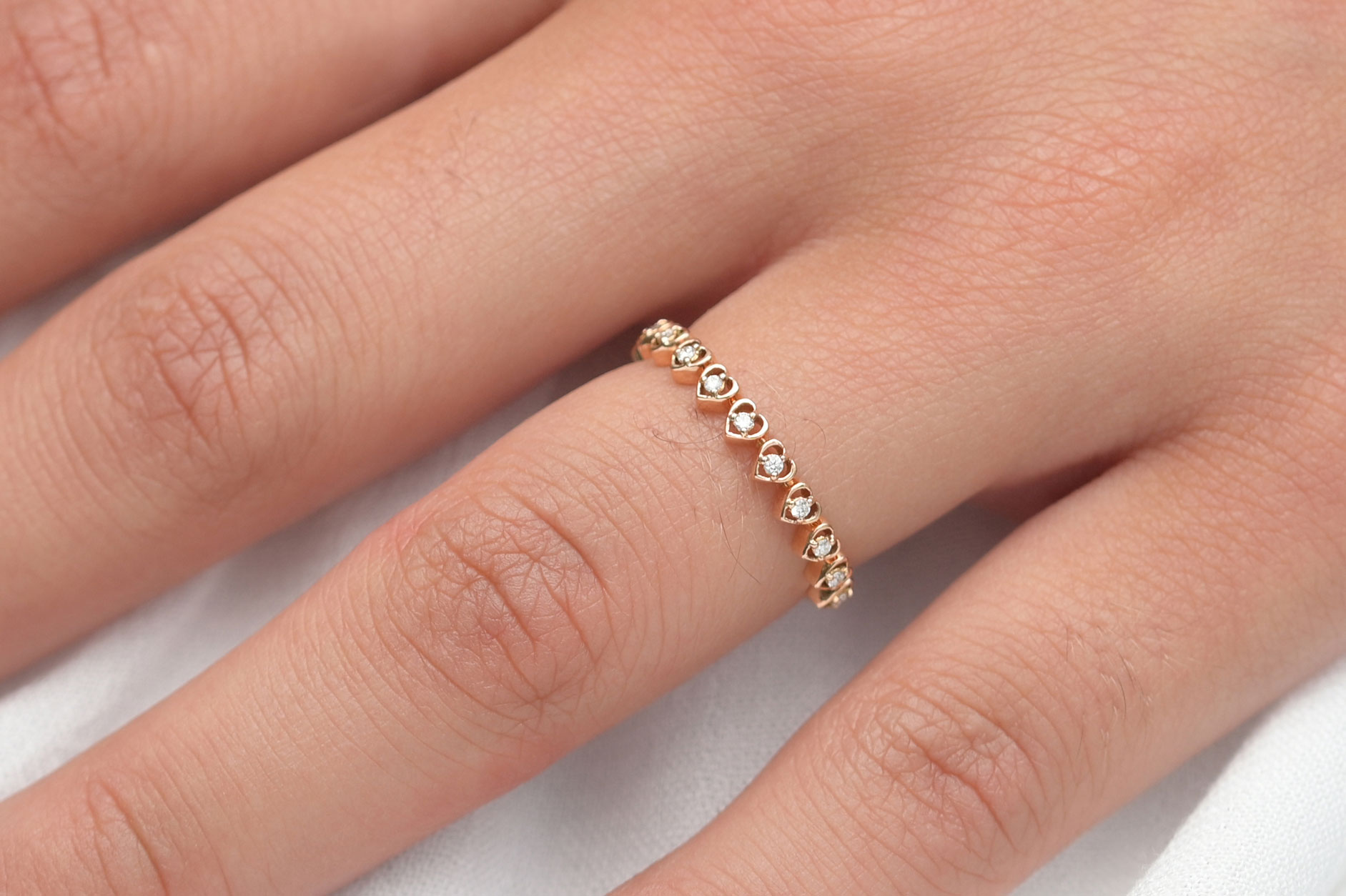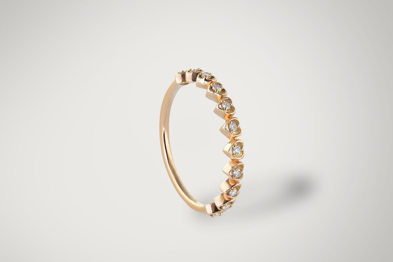 La bague Valentine, une alliance en demi-cercle en or 18 carats, séduit par ses petits cœurs alignés, chacun abritant un diamant pur. Avec ses 11 diamants étincelants (0,07 ct), elle reflète l’élégance et la délicatesse, sublimant la féminité de celle qui la porte.
