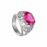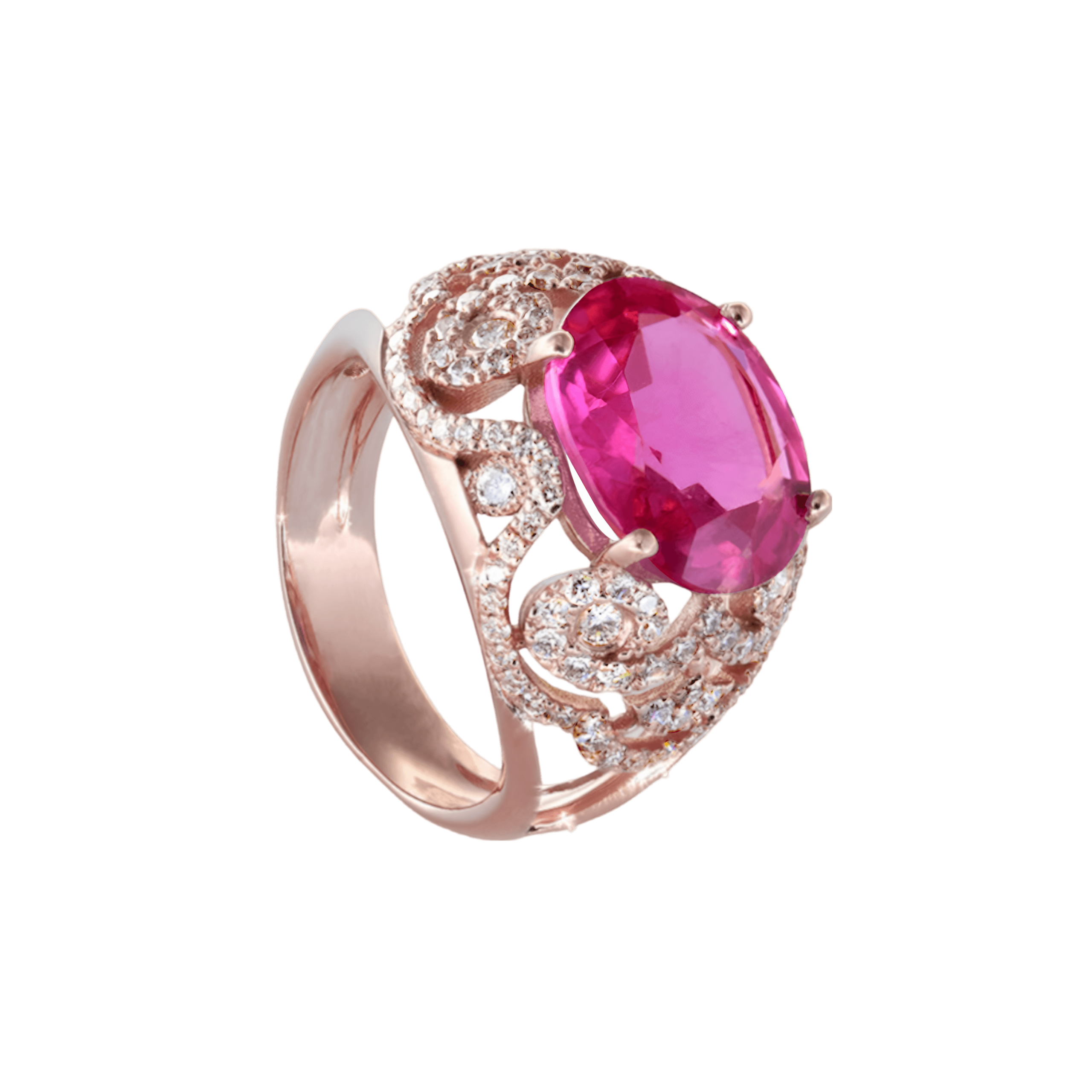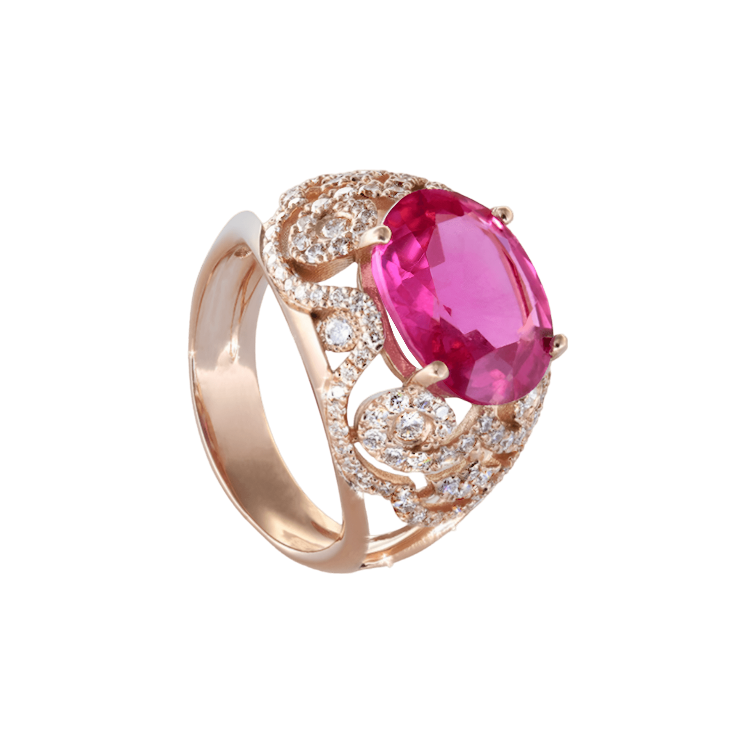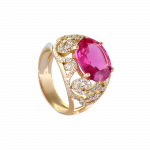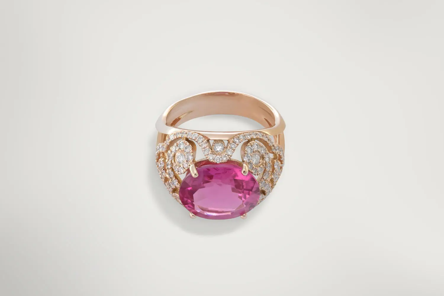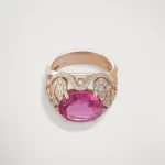 Découvrez la bague Sarah, un chef-d’œuvre en or qui marie avec grâce et élégance la magnificence de la tourmaline ovale rose.